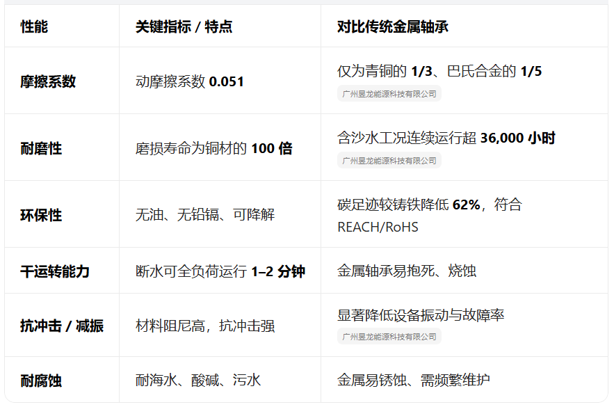 赛龙轴承:水润滑、无油、环保、耐磨、低维护、寿命长、抗泥沙、可干转应急。